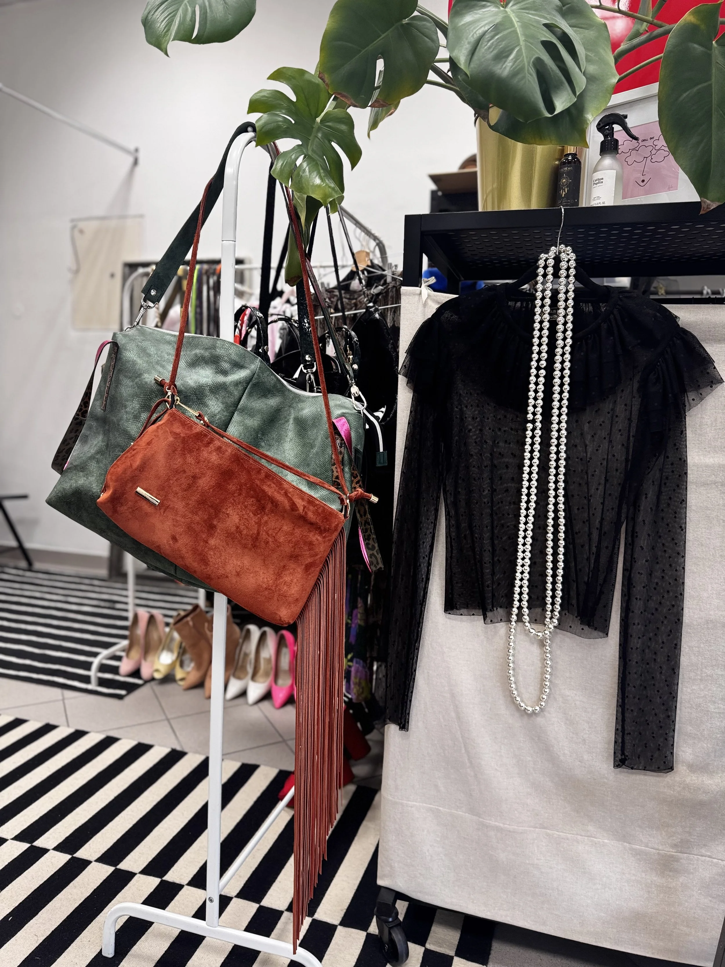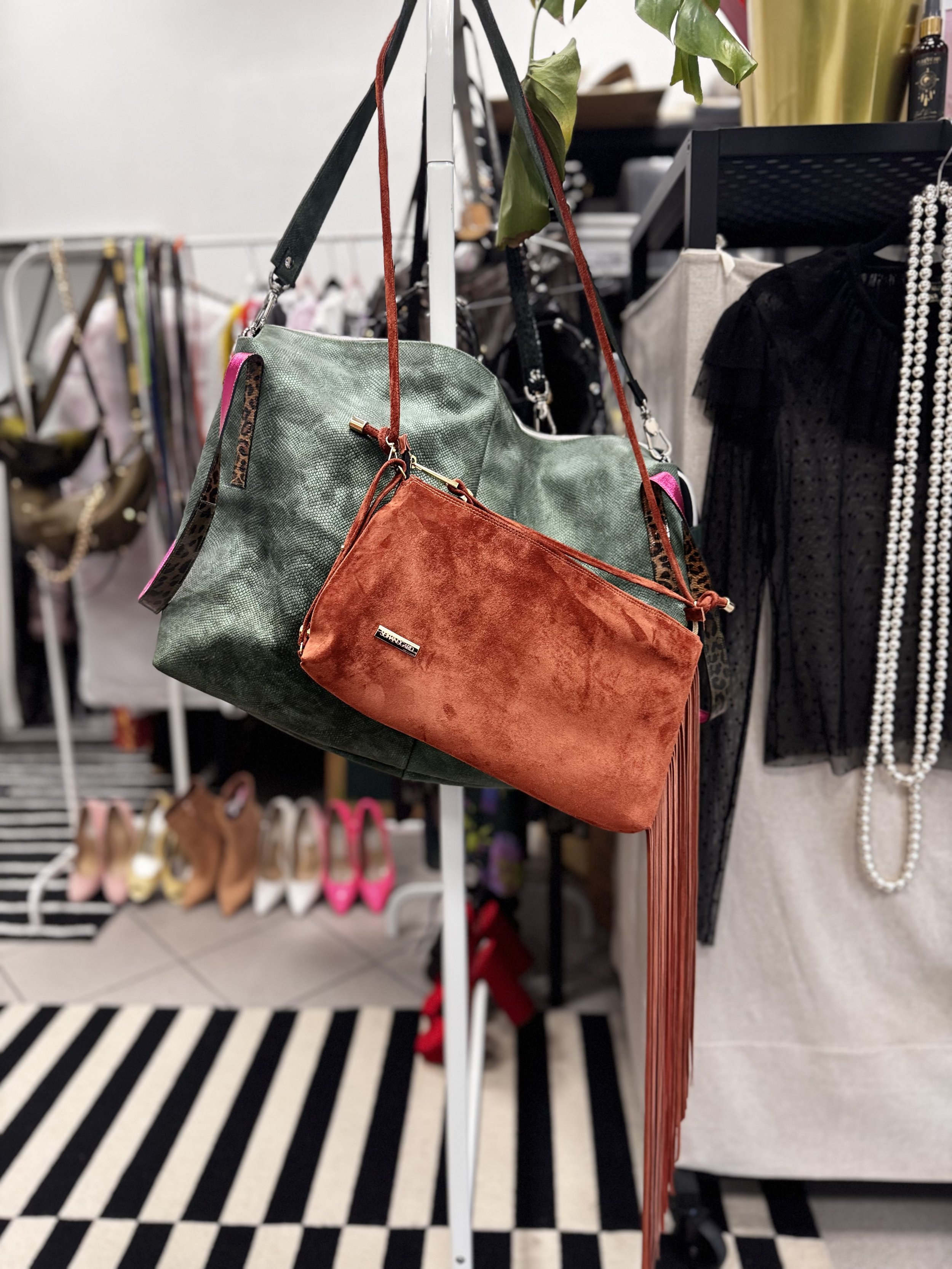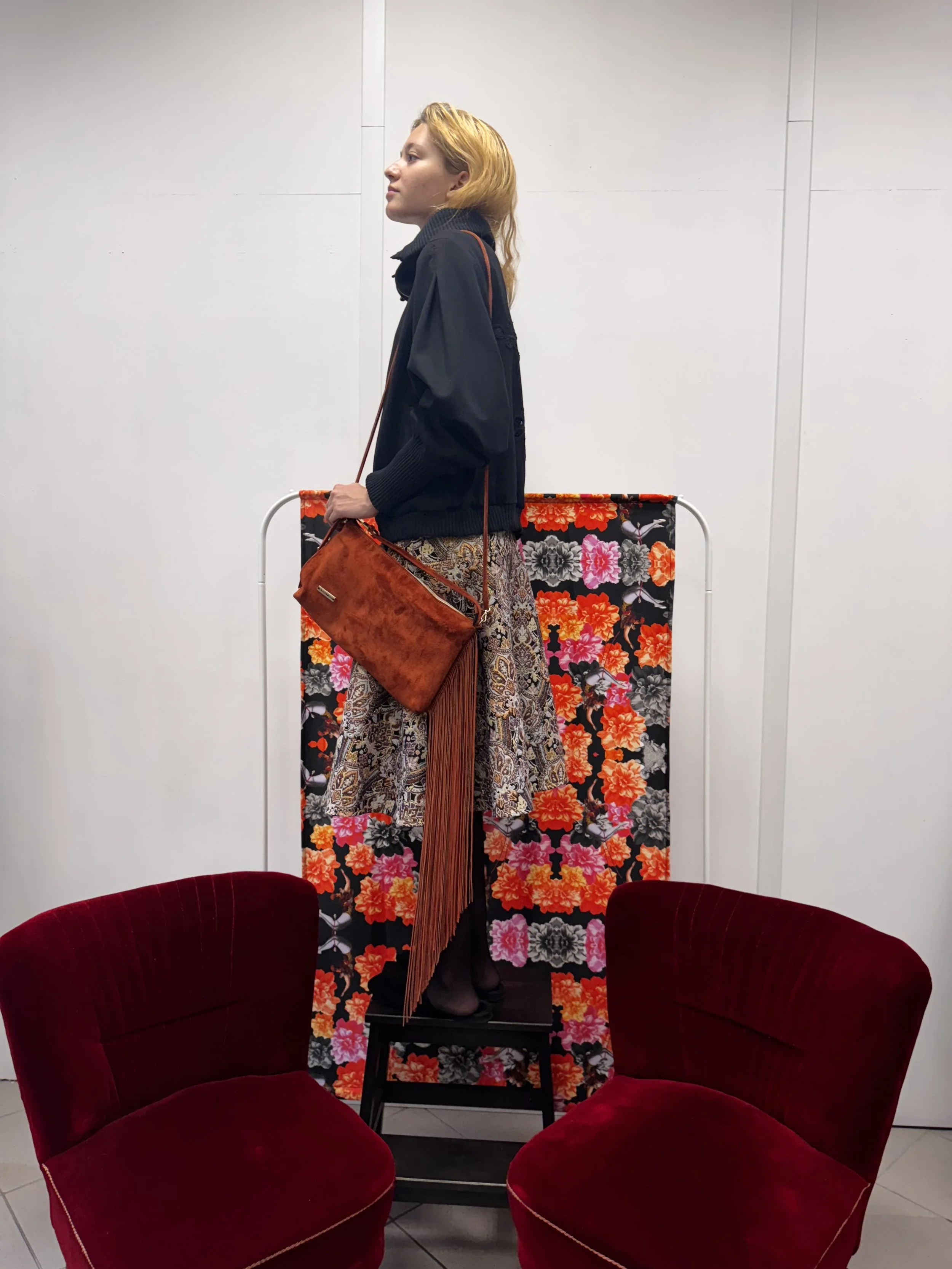 Šal iz kombinacije umetnega krzna v črni barvi. Podložen je z bombažem v vzorcu tiskanim posebej za to kolekcijo. Šal ovijemo okrog vratu in si ga poljubno zatisnemo . Zapira se na način, da gre ena stran skozi odprtino druge strani. Šal je preverjeno topel in primeren za mrzle dni.